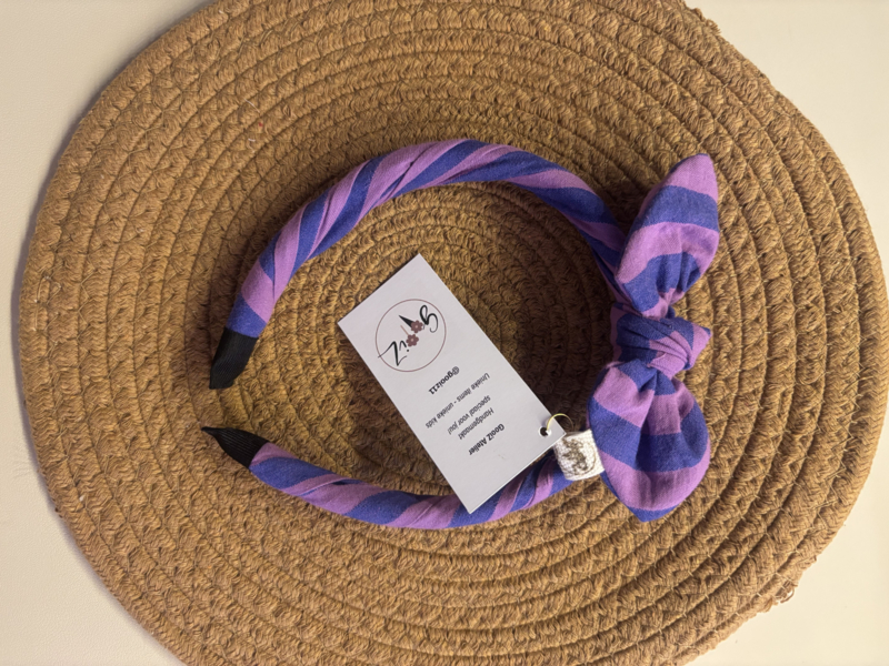 Handgemaakte zachte diadeem gevoerd met streepjesstof in blauw en lila met grote strik.